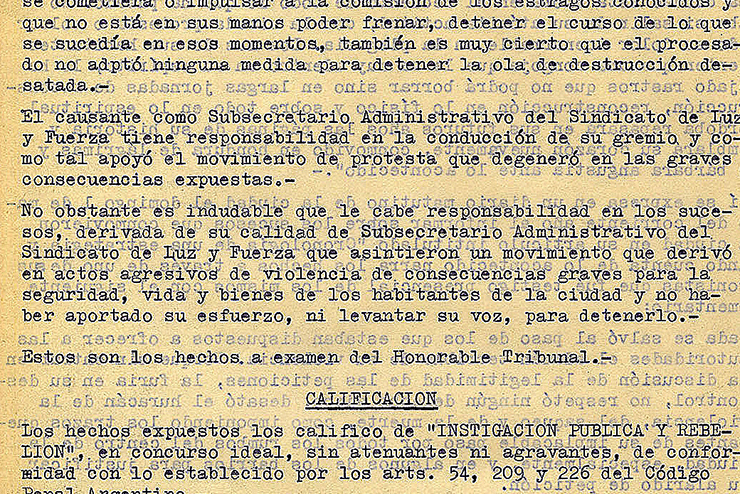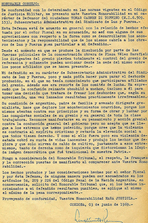 “Instigación pública” y “rebelión”. Esos son los cargos que levantó el Consejo Superior de las Fuerzas Armadas (Cosufa) contra Agustín Tosco, condenado a ocho años y tres meses de prisión; y a Tomás Di Toffino, secretario adjunto de Luz y Fuerza, que debía purgar cuatro años tras las rejas. Era la forma de golpear sobre la cabeza de la conducción del sindicato Luz y Fuerza, uno de los gremios que, junto al sindicato de mecánicos (SMATA) y a los choferes de la UTA, acicateó el Cordobazo.