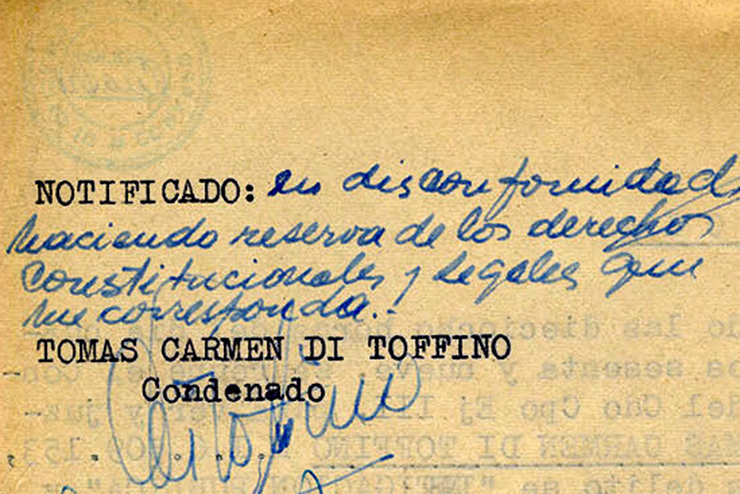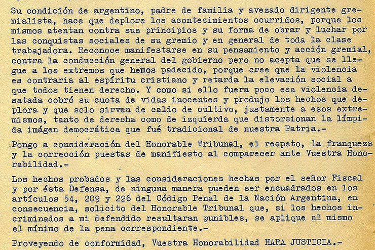 En su defensa, Di Toffino dijo que no había hecho otra cosa que cumplir con sus deberes de sindicalista. Su declaración quedó sintetizada en un párrafo y medio. Para la acusación del fiscal usaron dos páginas y lo responsabilizaron por “no adoptar ninguna medida para detener la ola de destrucción desatada”.