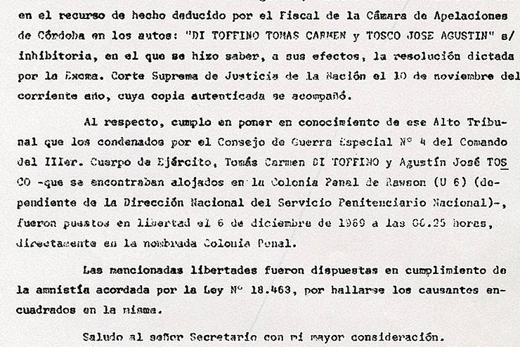 Tosco y Di Toffino fueron enviados al penal de Rawson pero antes de que terminara el año ya habían sido liberados: la dictadura no pudo sostener esas condenas y dictó una amnistía el 28 de noviembre de 1969.