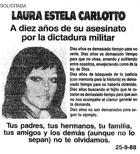 La joven fue secuestrada el 23 de febrero de 1977 y dio a luz a una niña el 16 de junio, en el Centro Clandestino de Detención que funcionó en la Comisaría 5ª de La Plata, bajo la órbita de la Policía de la Provincia de Buenos Aires.