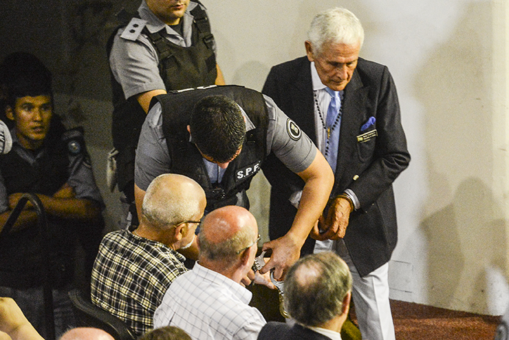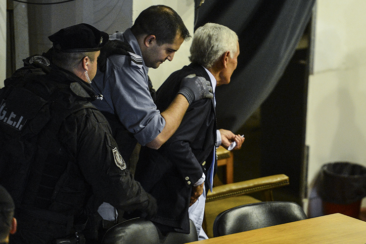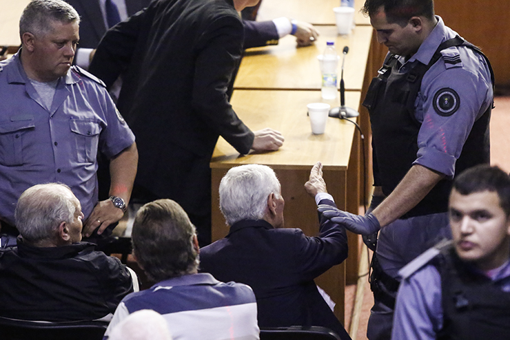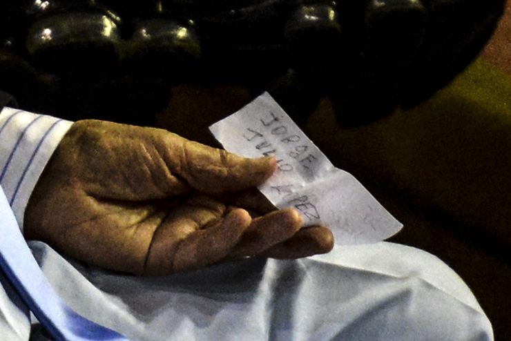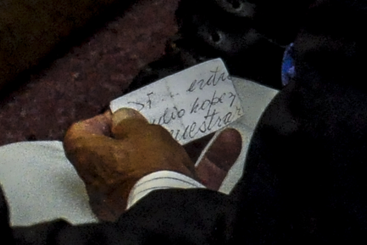 En una nueva secuencia fotográfica, esta agencia comprobó que el represor ya tenía el papel en su poder cuando entró a la sala. Según se desprende de las imágenes, lo habría desplegado minutos antes del final de la sentencia. Haciendo foco sobre sus manos, los fotógrafos de Infojus Noticias descubrieron que decía “Jorge Julio López”.