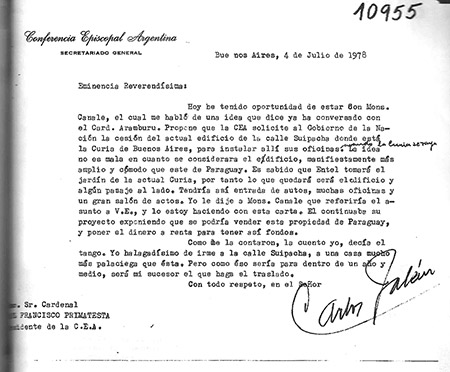 - También figura la nota de Galan Barry a Primatesta de 1978, en la cual le informa que el cardenal Aramburu estaba de acuerdo en pedir a la dictadura la cesión del edificio de la calle Suipacha para instalar allí las oficinas de la Conferencia episcopal, “con entrada de autos, muchas oficinas y un gran salón de actos” y “mucho más palaciega” que la casa que ocupaban entonces, que podría venderse “y poner el dinero a renta”. En ese edificio, que Videla les donó en 1981, anunciaron ahora la apertura de archivos.