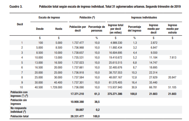 El último documento sobre Evolución de la distribución del ingreso que elabora el INDEC -correspondiente al segundo trimestre de 2019- arrojó que más de la mitad de la población gana menos que el salario mínimo vital y móvil, cuya reciente actualización lo elevó hasta los $ 16.875.