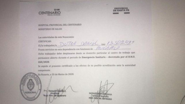 “Ese certificado, el original, lo firmamos la administradora y yo, porque había un montón de personal que debía circular por la calle y si no tenía alguna constancia, no podía”, dijo para agregar que desde la oficina de personal entregaron a cada jefe la cantidad que necesitaba para cada turno.