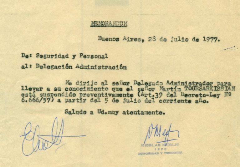 - Martín Toursarkissian era botánico e investigador en el Museo Argentino de Ciencias Naturales “Bernardino Rivadavia” (MACN). Fue secuestrado de su domicilio en Villa Luro por fuerzas conjuntas y de seguridad, la madrugada del 5 de julio de 1977. Tenía 53 años de edad. Fue visto en varios Centros Clandestinos de Detención: Regimiento de Infantería 1 “Patricios” (Ciudad de Buenos Aires), Regimiento de Infantería Mecanizado 3 “General Belgrano” (La Tablada) y en un espacio de reclusión ilegal sin especificar en Magdalena.