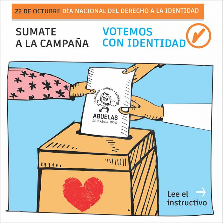 Abuelas de Plaza de Mayo invita a sacarse una foto o grabar un video con la constancia de haber votado, con el sobre o la boleta y luego subirla a redes sociales con el siguiente texto y hashtags: «El 22 de octubre -Día Nacional del Derecho a la #Identidad #VotemosConIdentidad». También es importante etiquetar a @abuelasdifusion.