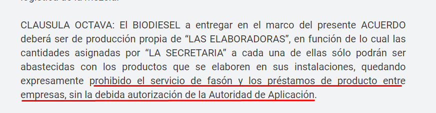 La maniobra de Bio Ramallo —señalan los trabajadores— viola la cláusula octava de la Resolución 56/2012 de Acuerdo de Abastecimiento de Biodiesel para su Mezcla con Combustibles Fósiles en el Territorio Nacional, que prohíbe el servicio de fasón (manufactura de un producto por mandato de un tercero) y los préstamos de producto entre empresas sin debida autorización.