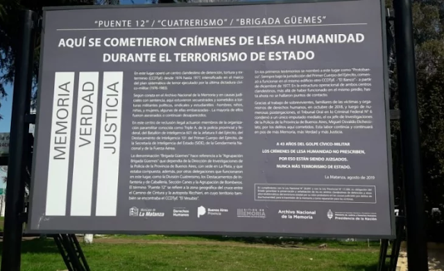 Desde noviembre de 1974 hasta febrero de 1977, el Centro Clandestino de Detención Tortura y Exterminio Puente 12 operó en la intersección de Camino de Cintura y la Autopista Riccheri, en una zona geográfica denominada “Puente 12”, bajo el control jurisdiccional del Primer Cuerpo de Ejército, Comando de Zona de Defensa 1, Subzona 11, a cargo de la X Brigada de Infantería Mecanizada. Tiempo después, en el mismo predio funcionó el centro clandestino El Banco, y enfrente estuvo localizado el CCDTyE El Vesubio.
